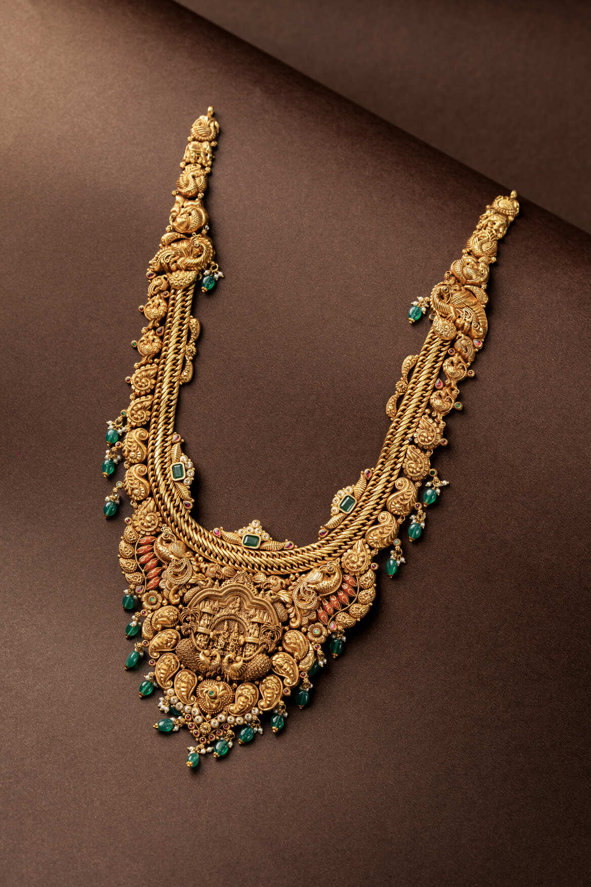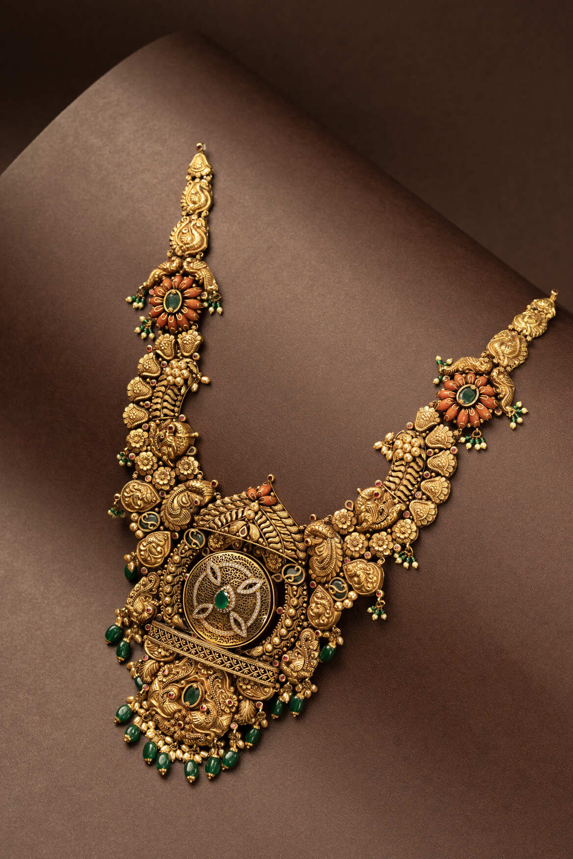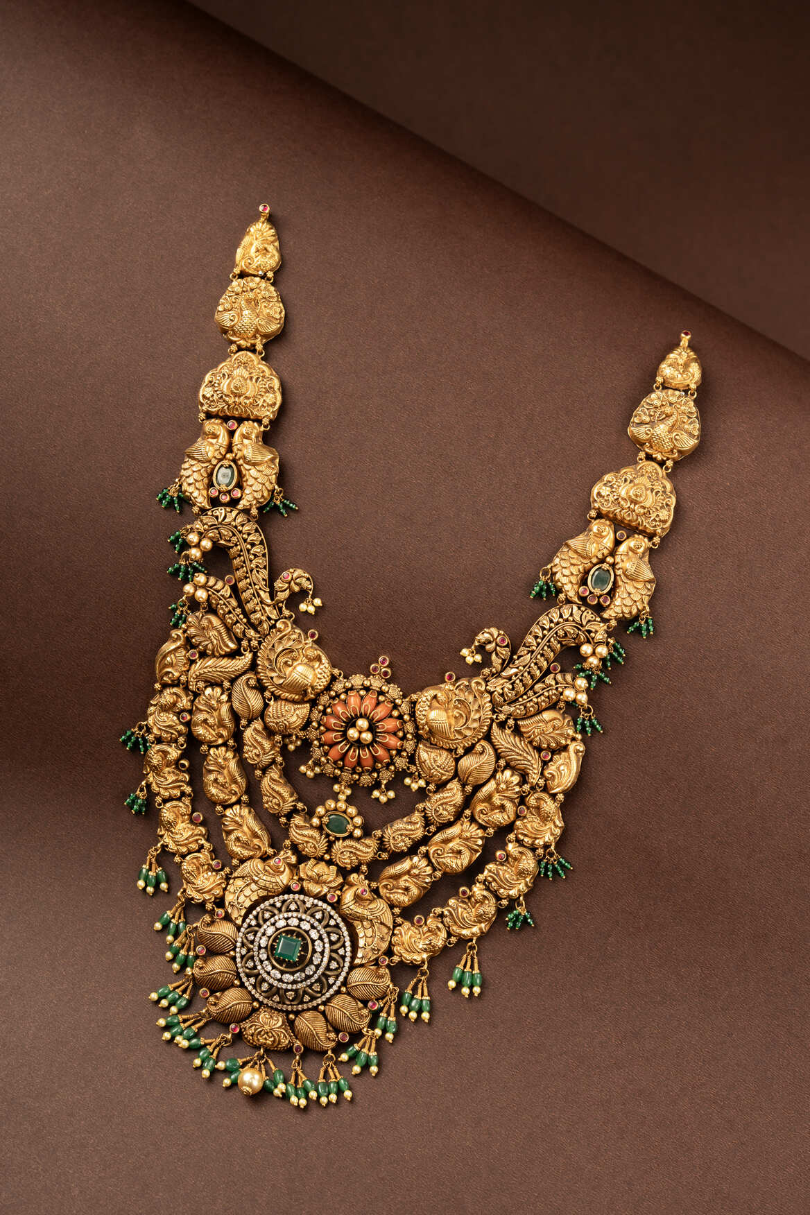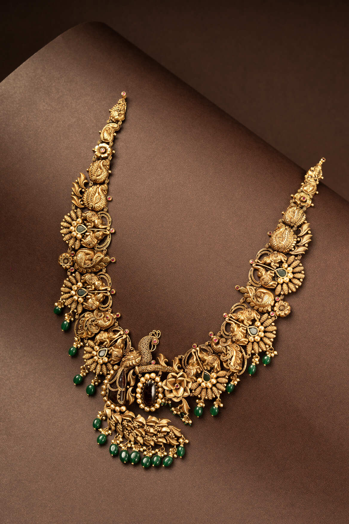 Intricately handcrafted using age-old techniques, Nakshi jewellery is known for deep detailing and rich traditional appeal. These statement designs are especially cherished for bridal wear, temple jewellery, and cultural celebrations.